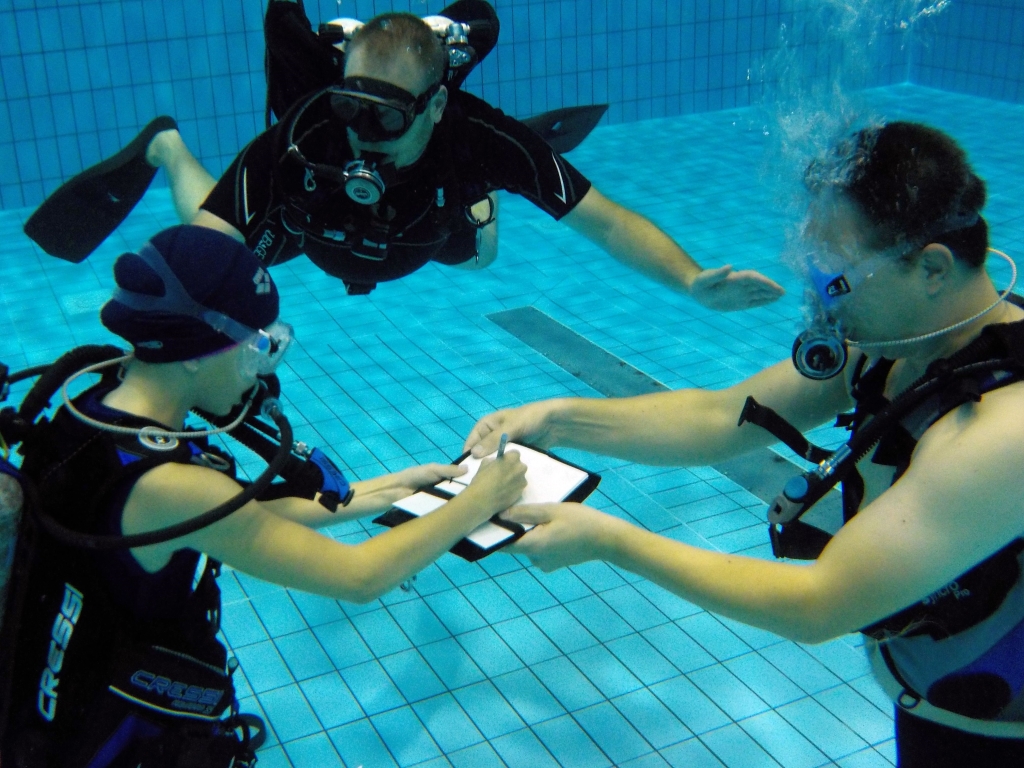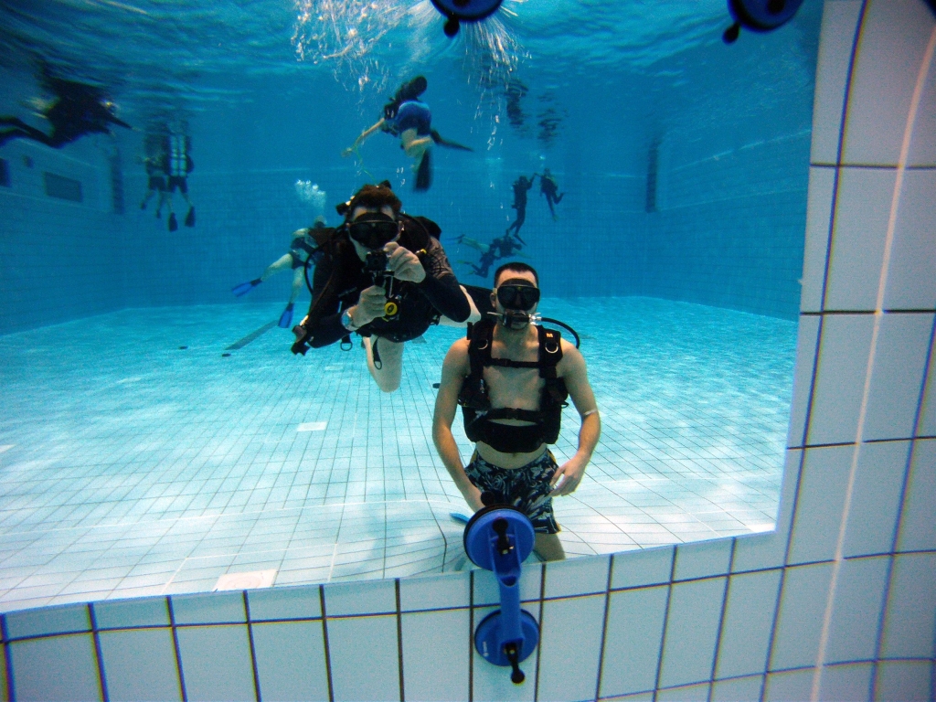 Der Druckausgleich, der den Druck im Mittelohr an den Umgebungsdruck angleicht, verhindert starke Schmerzen im Ohr, da der Druck beim Tauchen in die Tiefe auf das Trommelfell bzw. Mittelohr zunimmt. Gegen Mittag und nach einer Stärkung war es endlich soweit, wir konnten ins Wasser. Mit Tauchmaske, Schnorchel und Flossen ausgestattet, gingen wir in die Schwimmhalle und absolvierten unter Aufsicht unsere ersten Tauchmeter. Streckentauchen, "Ringe holen", Zeittauchen und Abschleppen füllten den ersten Teil des Nachmittages.
