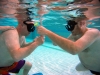 Der Sonntag startete ebenfalls um zehn Uhr mit einer weiteren Theoriestunde im VIP-Raum. Nach einer Wiederholung der Themen des Vortages und dem neuen Thema "Grundlagen der Tauchphysik" stärkten wir uns mit Gulasch und Nudeln (sehr lecker!) für den langen Tauchgang im fast fünf Meter tiefen Tauchbecken. Nach der Mittagspause baute jede Gruppe die Tauchausrüstung selbstständig zusammen. Selbstverständlich standen die Ausbilder mit geschultem Blick immer beiseite. Und nun endlich, wir konnten tauchen gehen. Mit unseren Tauchlehrern tauchten wir entspannt ins Sprungbecken ab. Diesmal für eine längere Zeit, für fast 45 Minuten. Wir bewegten uns nahezu schwerelos und dreidimensional im Wasser. Auf dem Boden des Sprungbeckens spielten wir z. B. mit einem Unterwasserball, einem Spieltorpedo oder entspannten bei einer Runde Unterwasser-Tick-Tack-Toe.