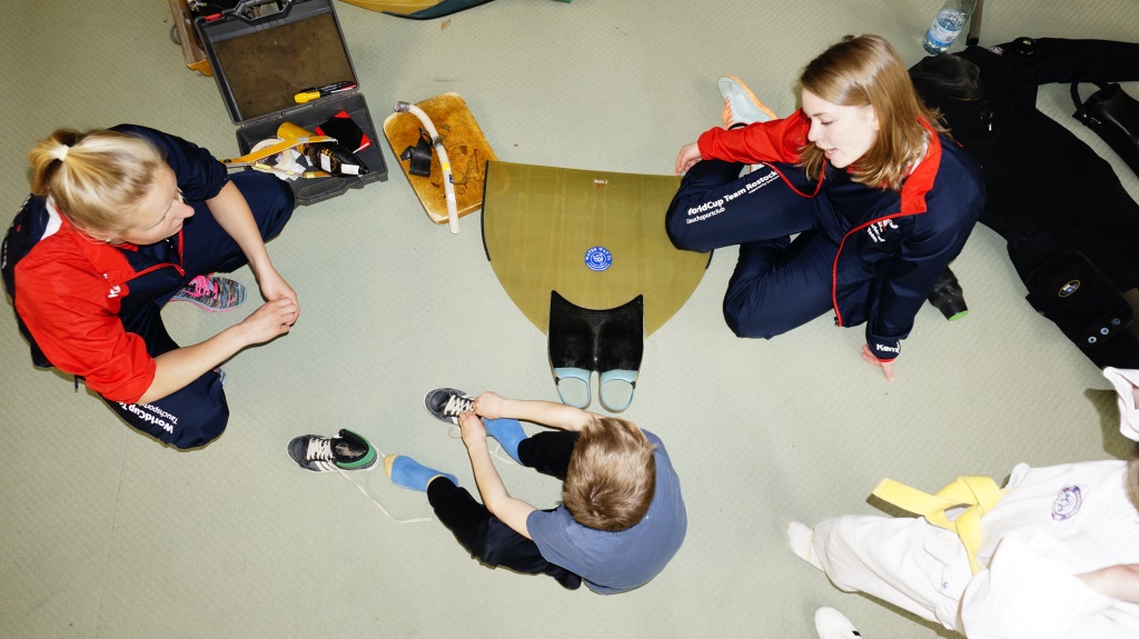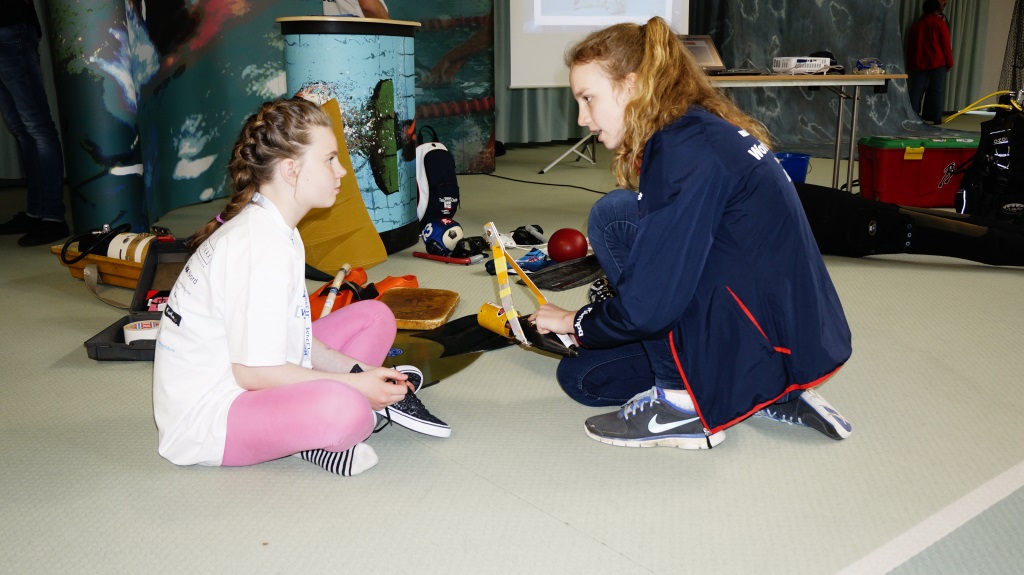 Neben einer Foto- und Videopräsentation hatten wir verschiedene Ausrüstungsgegenstände mitgebracht, die von den Kindern interessiert betrachtet und z.T. auch ausprobiert wurden. Wir hoffen, einige der Gäste zu einem Probetraining in der Schwimmhalle begrüßen zu können. Dazu wird sicherlich auch der Beitrag in der Ostseezeitung beitragen, in dem der TSC neben zwei anderen Vereinen hervorgehoben wurde.