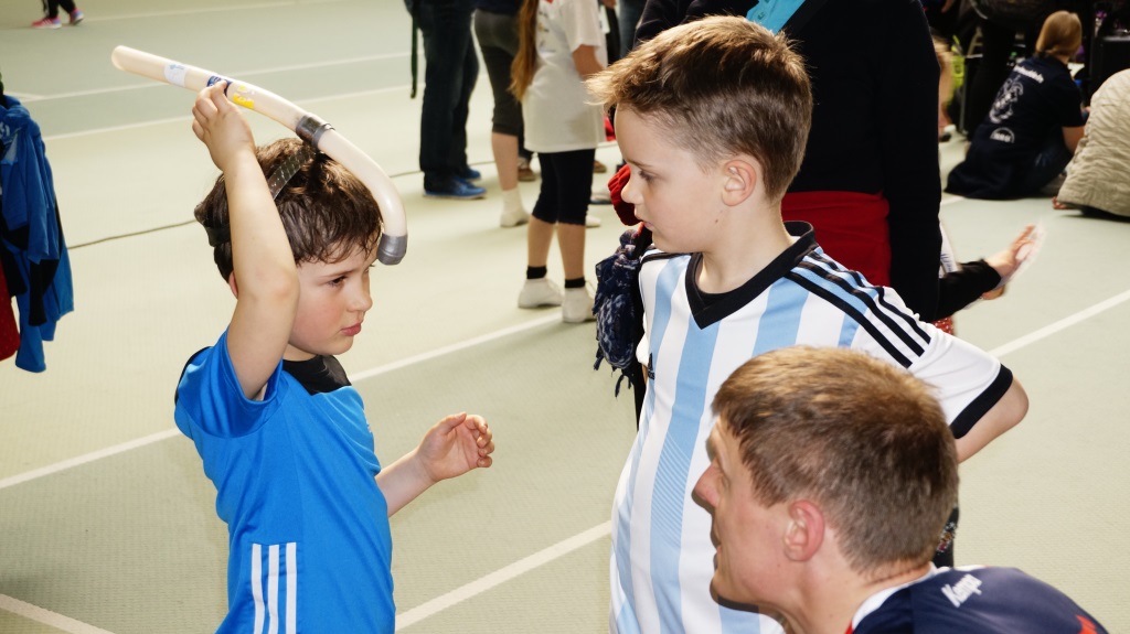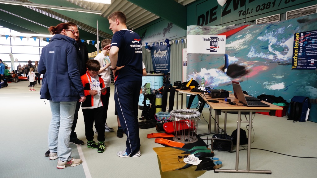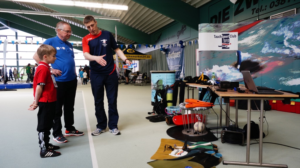 Das Ausprobieren von Ausrüstungsgegenständen wie Monoflossen oder Atemregler stand bei den Mädchen und Jungen zwischen vier und zwölf Jahren hoch im Kurs. Obwohl sich der Reiz unserer Wassersportarten in einer Turnhalle natürlich nur eingeschränkt demonstrieren lässt, haben wir doch mit Hilfe einer Foto- und Videopräsentation sowie in unzähligen Gesprächen zumindest ansatzweise die Faszination von Flossenschwimmen, Orientierungstauchen, Sporttauchen und Unterwasserrugby vermitteln können.