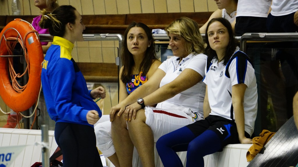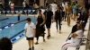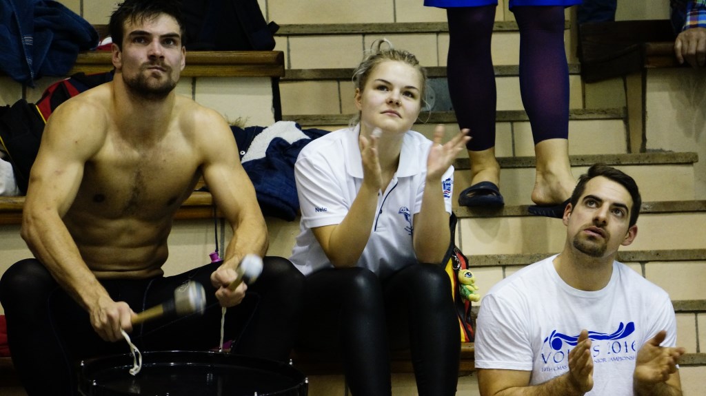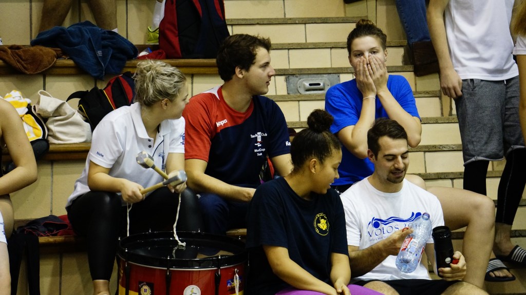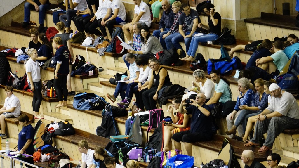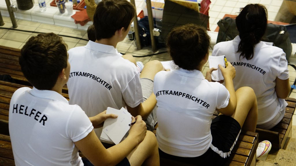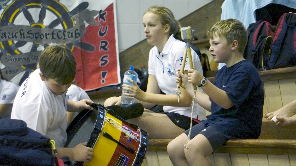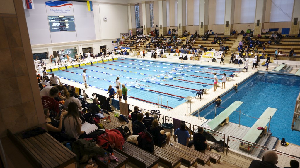 Der Marmorsaal der Neptunschwimmhalle ist fertig eingerichtet und wird heute Abend Schauplatz der Pokalübergaben sowie einer sicherlich ausgelassenen Feier sein. Die Helfer sind in der Zwischenzeit zum 25-m-Becken gekommen um die Sportler bei der gleich folgenden 4x100m Staffel im Flossenschwimmen anzufeuern.