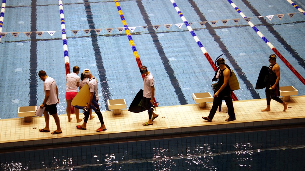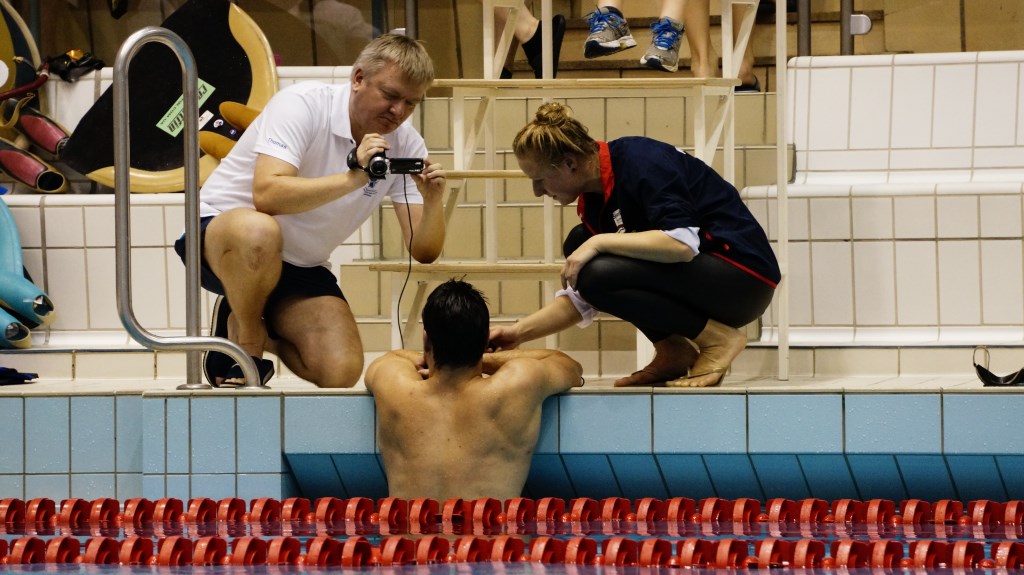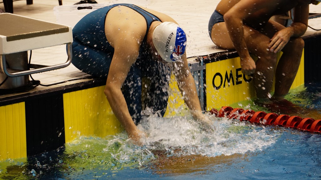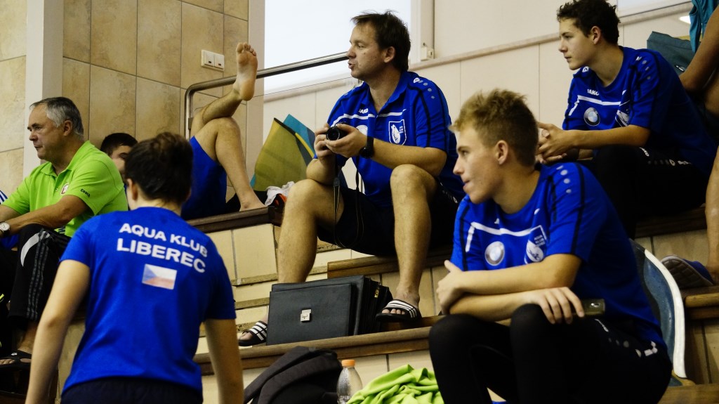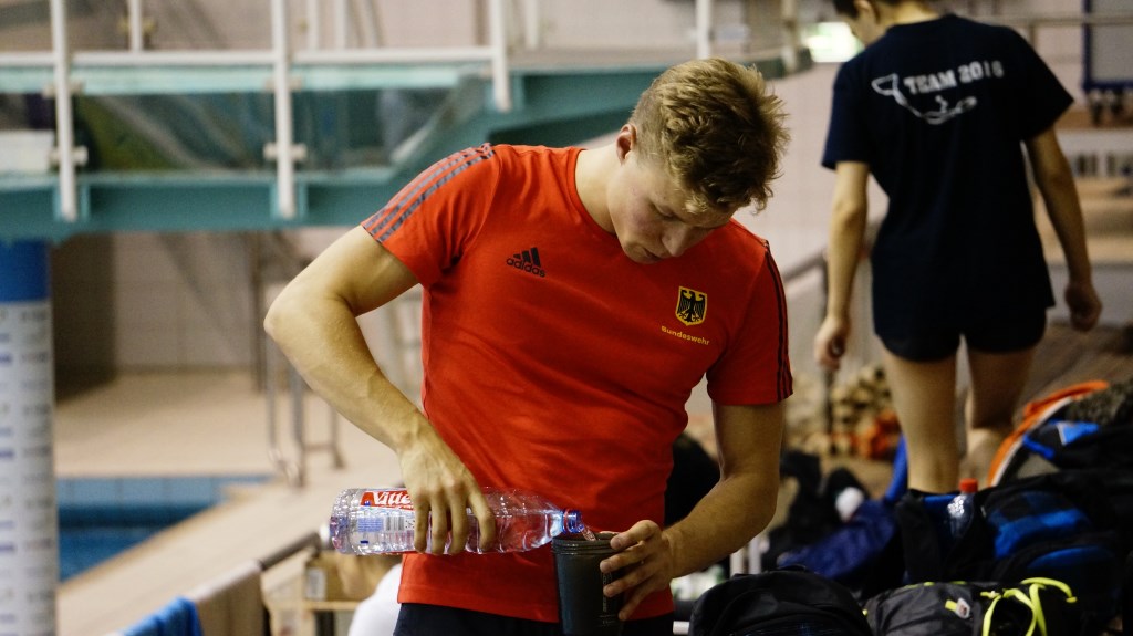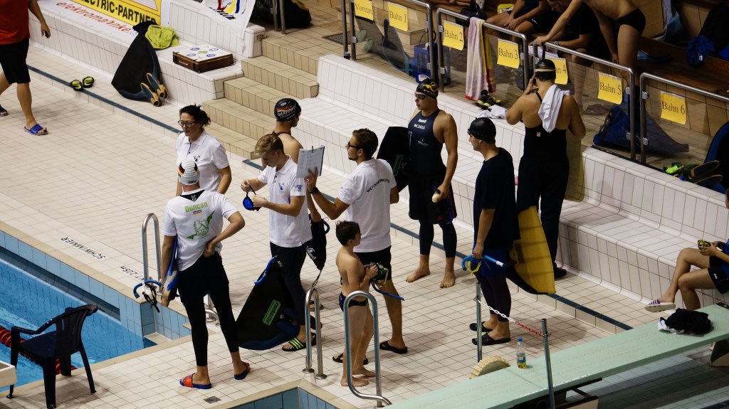Für heute stehen vierzehn Wettkämpfe auf dem Programm. Eben wurde das 4x50m Streckentauchen der Männer gestartet.