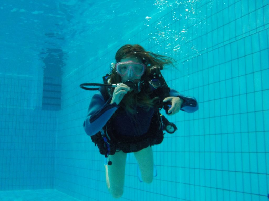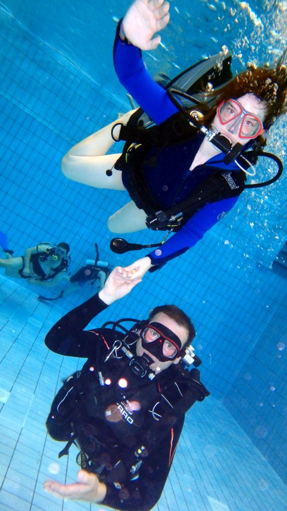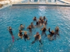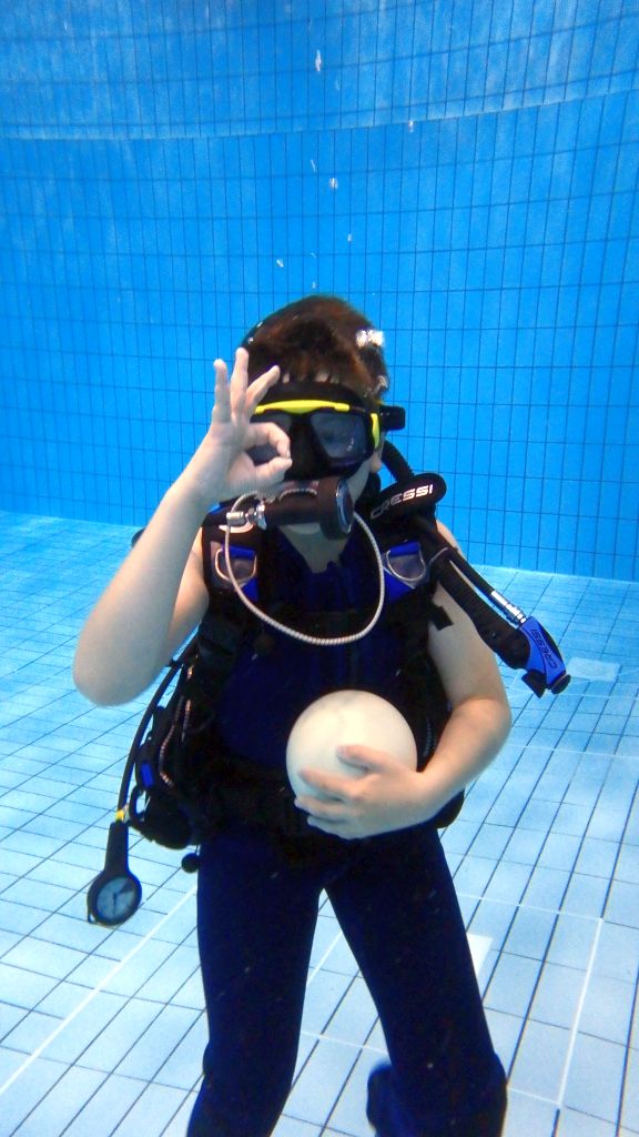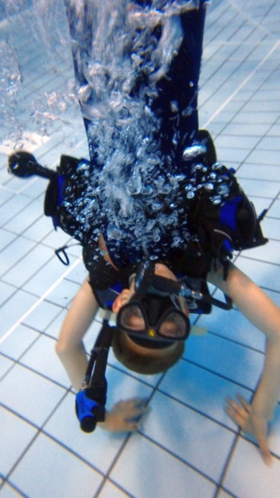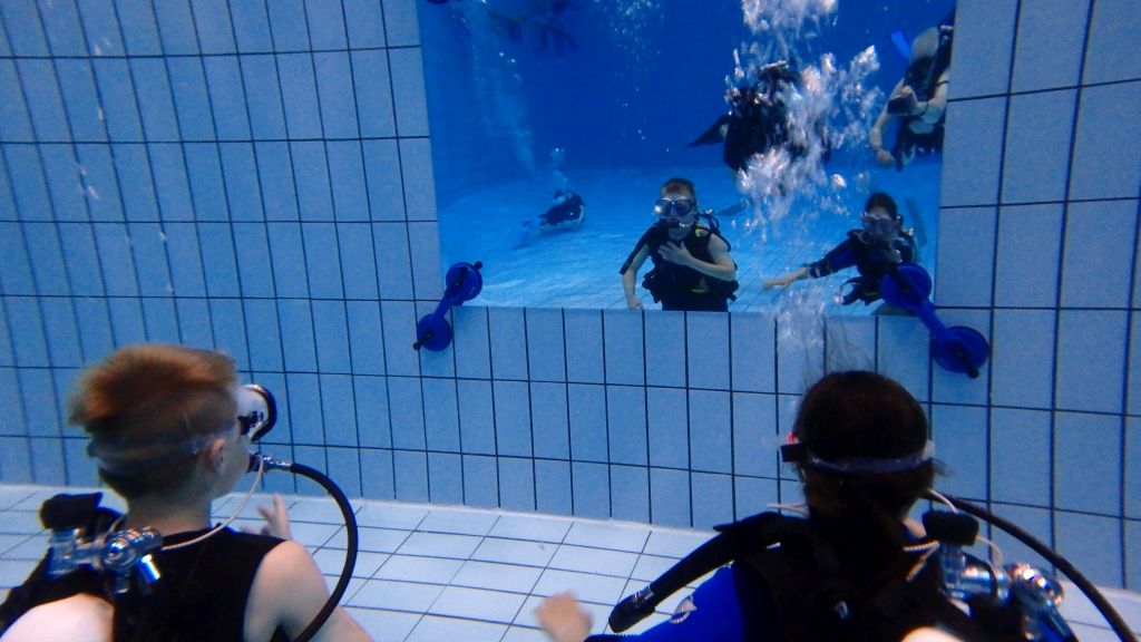 Im Wasser Teil 3 ging es dann für alle nochmal ins Sprungbecken. Mit den Erfahrungen des Vortages fühlten sich alle schon fast wie die Fische im Wasser. Im UW-Spiegel an der Beckenwand konnten sich alle kleinen Taucher erstmals selbst begutachten, um sich dann mit der Vielzahl an UW-Spielzeug zu beschäftigen. So verflog auch hier wieder die Zeit wie im Fluge und der Luftvorrat der 4-l-Flasche auf dem Rücken erreichte langsam den Reservebereich. Zum Abschluss konnten alle nochmal ihren Mut bei Sprüngen vom 3m und 5m-Meter-Brett beweisen.