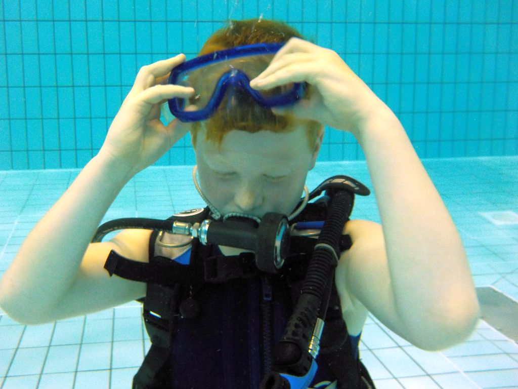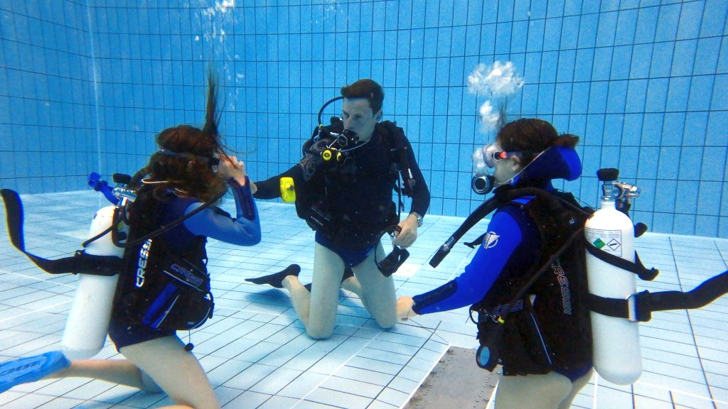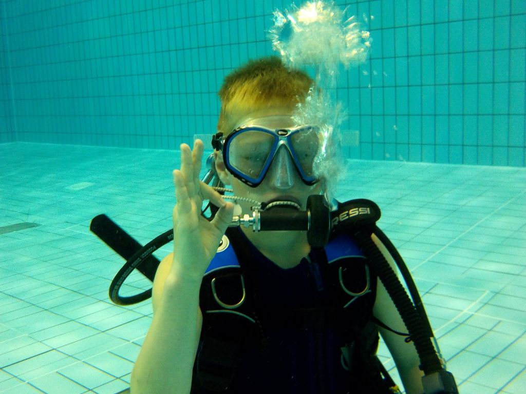 Nach einer kleinen Stärkung ging es im Schulungsraum mit Erklärungen zum Tauchgerät, bestehend aus Druckluftflasche, Jacket und Regler weiter. Hier lernten alle den richtigen Umgang und die Funktion der einzelnen Bestandteile. So vorbereitet konnte es zum zweiten Mal ins Wasser gehen. Diesmal in das 4,80 Meter tiefe Sprungbecken. Unter der 1:1-Betreuung der erfahrenen Tauchlehrer und Übungsleiter konnten alle erste Erfahrungen mit dem Tauchgerät sammeln. Nur die vier KTSA-Schüler hatten mit den ersten Aufgaben unter Wasser zu "kämpfen". Ziemlich erschöpft aber begeistert endete so der erste Tag.