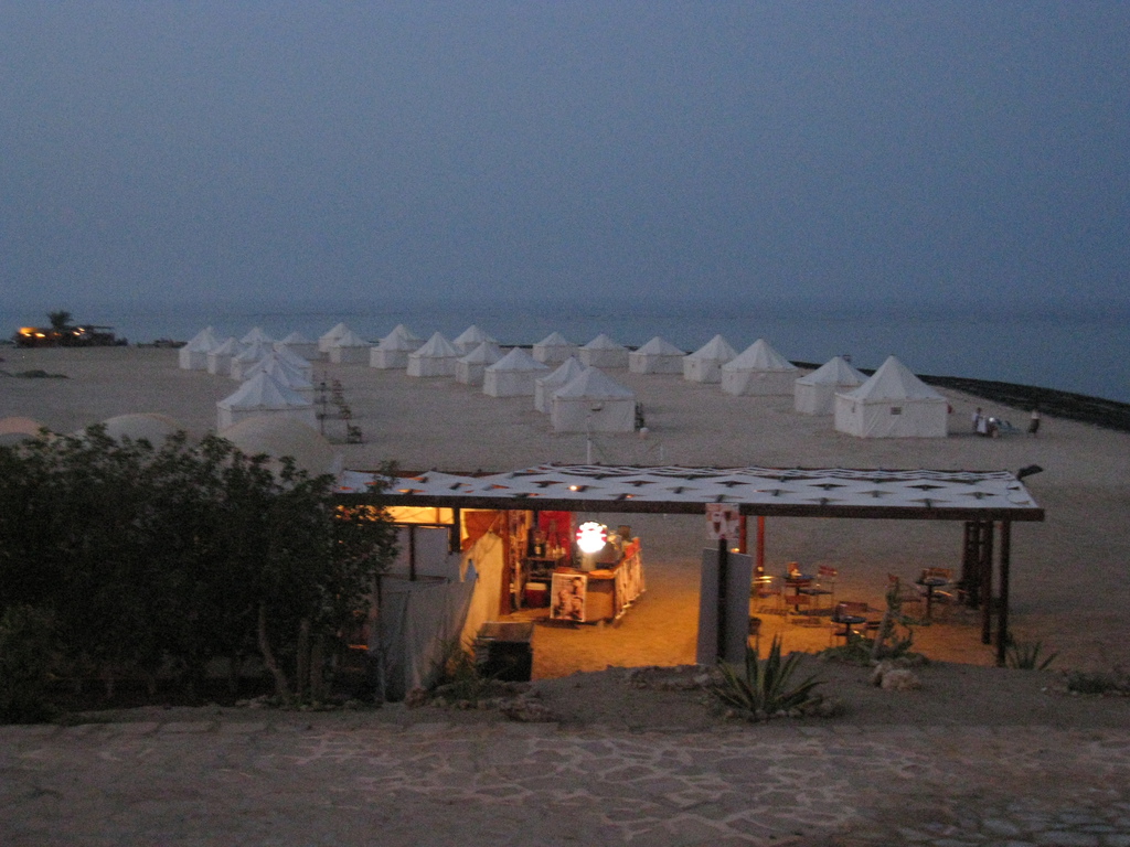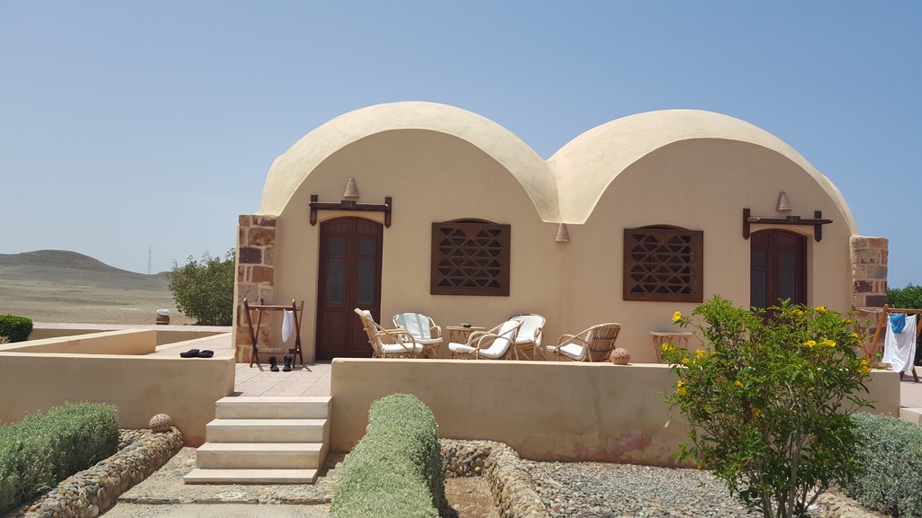 Das „Shagra Village“ ist genau auf unser Hobby Tauchen zugeschnitten. Rezeption, Tauchbasis, kleiner Andenkenladen, Cafe, Restaurant und Unterkünfte – fertig, fast, beinahe hätte ich das Rote Meer mit dem scheinbar unendlichen Riff vergessen. Es stehen verschiedene Unterkünfte zur Auswahl, sowohl einfache und komfortablere Zelte oder Chalets. Die Zelte stehen direkt am Strand, keine 50 Meter vom Wasser entfernt, die Chalets in einem weiten Bogen aufgereiht. Die Ausstattung ist spartanisch zu nennen, außer zwei Betten gab es noch je einen Nachttisch, Schreibtisch, Hocker, Kühlschrank, Schrank mit Safe, Wasserkocher und sage und schreibe zwei Tassen! Um es nicht zu verheimlichen, unser erstes Chalet hatte sogar einen Fernseher, dafür gingen weder Safe noch Klimaanlage und die Tür öffnete sich erst nach langem Kampf. Das mag sich anhören als wären wir mit unserer Wahl nicht zufrieden gewesen aber das Gegenteil ist der Fall. Schlafen Essen Tauchen - darum drehte sich unser Aufenthalt. Gut - schlafen war nicht immer einfach, das lag zum großen Teil an den wenigen "Landlebewesen" der Gegend, kleine blutrünstige Mücken mit aggressivem Summen. Dafür waren Frühstück, Mittag und Abendessen abwechslungsreich und wohlschmeckend, der Nachtisch war das i-Tüpfelchen... Hier möchte ich auch gleich das überaus aufmerksame und freundliche Personal erwähnen, immer gut gelaunt und so flink, dass man es sich genau überlegen musste, das Besteck auf den Teller abzulegen.