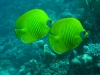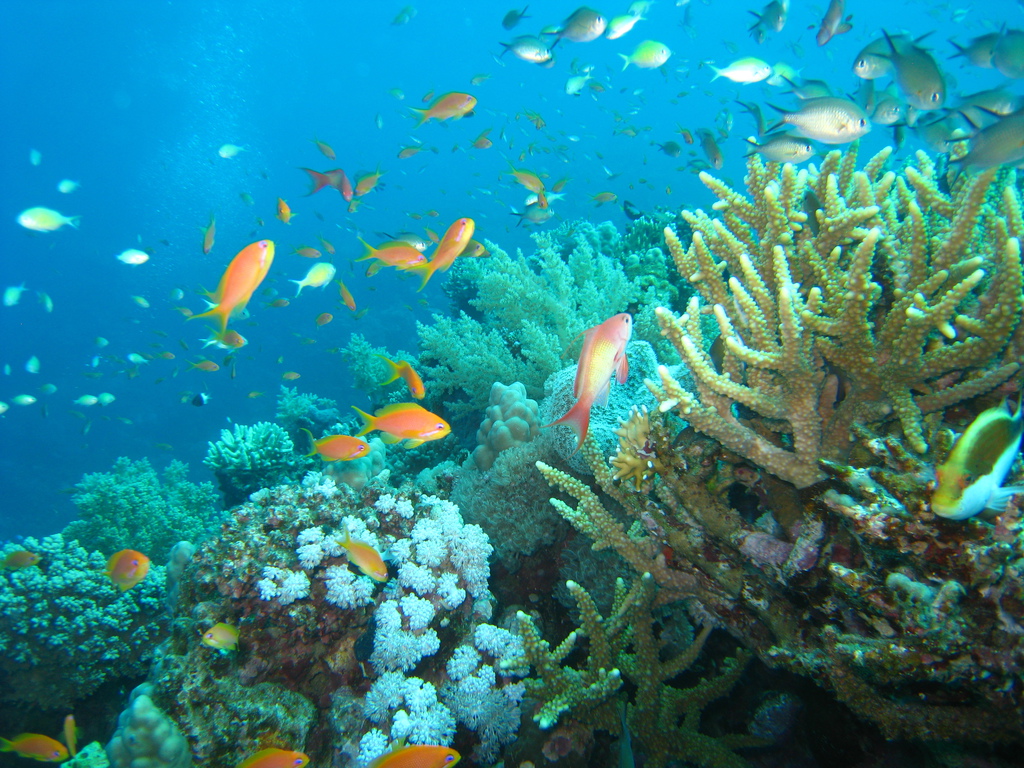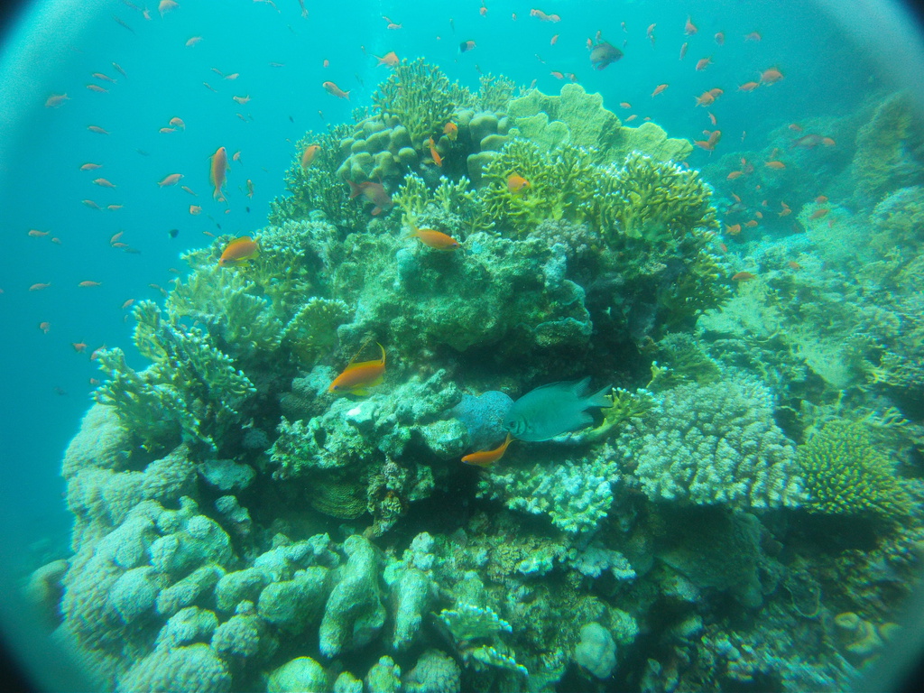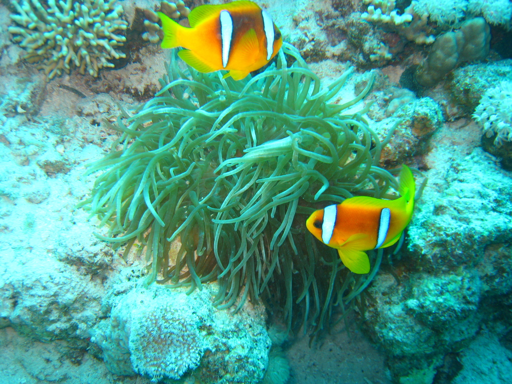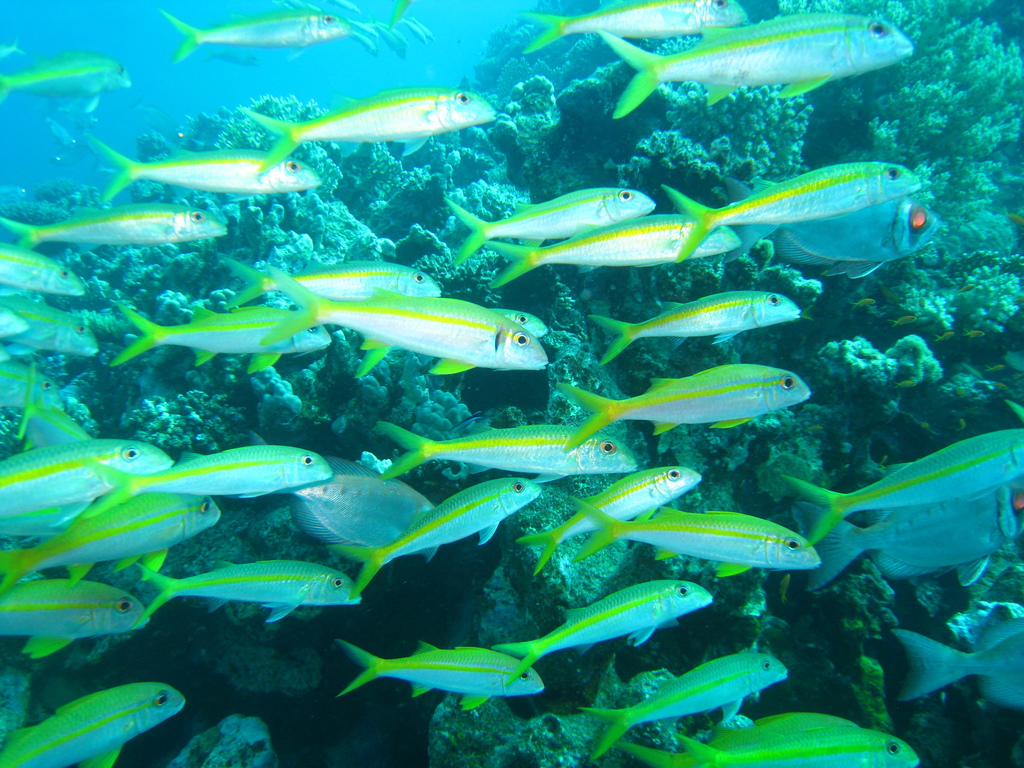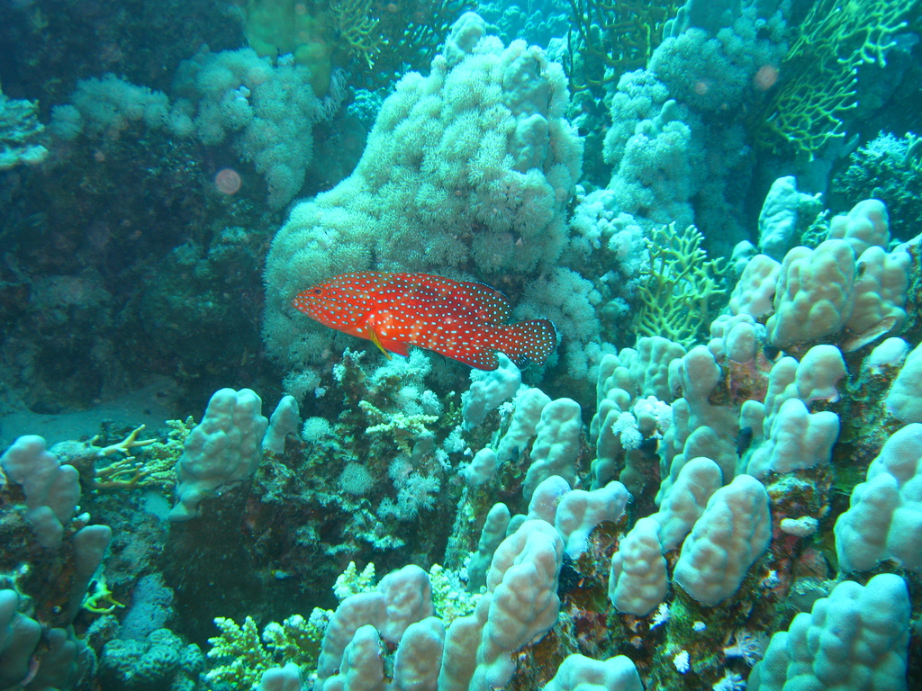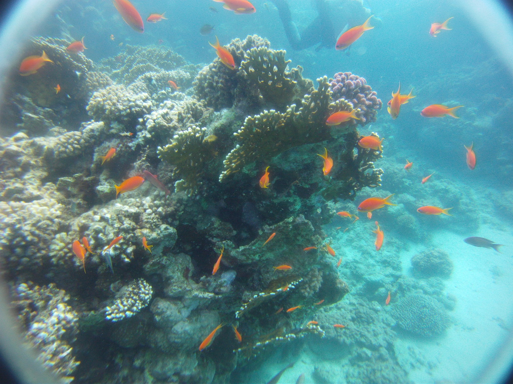 Im Gegensatz zu den "alten Hasen" war ich das erste Mal am bzw. im Roten Meer und eine Erfahrung war die doch recht erhebliche Bleimenge. Tauche ich in der Ostsee benötige ich 8 Kilo, im Roten Meer dagegen 14, zwischenzeitlich sogar 16 Kilo!!!! Wichtig war auch Maradonas Hinweis eine 15 Liter Flasche zu nutzen, da mein Luftverbrauch - untertrieben gesagt - überdurchschnittlich ist. Aber genug der Vorrede, im Gegensatz zu der bereits erwähnten Eintönigkeit an Land ist das Leben unter Wasser unglaublich vielfältig, es gibt nicht nur Fische in den unterschiedlichsten Größen, Formen und Farben auch die Korallen bieten Abwechslung ungeahnten Ausmaßes. Die Farbpalette reicht von weiß, gelb, rosa, grün, blau, braun bis schwarz, die Aufzählung ist mit Sicherheit nicht vollzählig. Ob Weich- oder Hartkoralle, auch die Formen sind vielfältig - von filigran über kräftig bis zu massiv. Ich hatte beim Tauchen mehrfach den Eindruck über die Korallenriffe zu "fliegen", Fische vor, über, unter, hinter und neben mir....