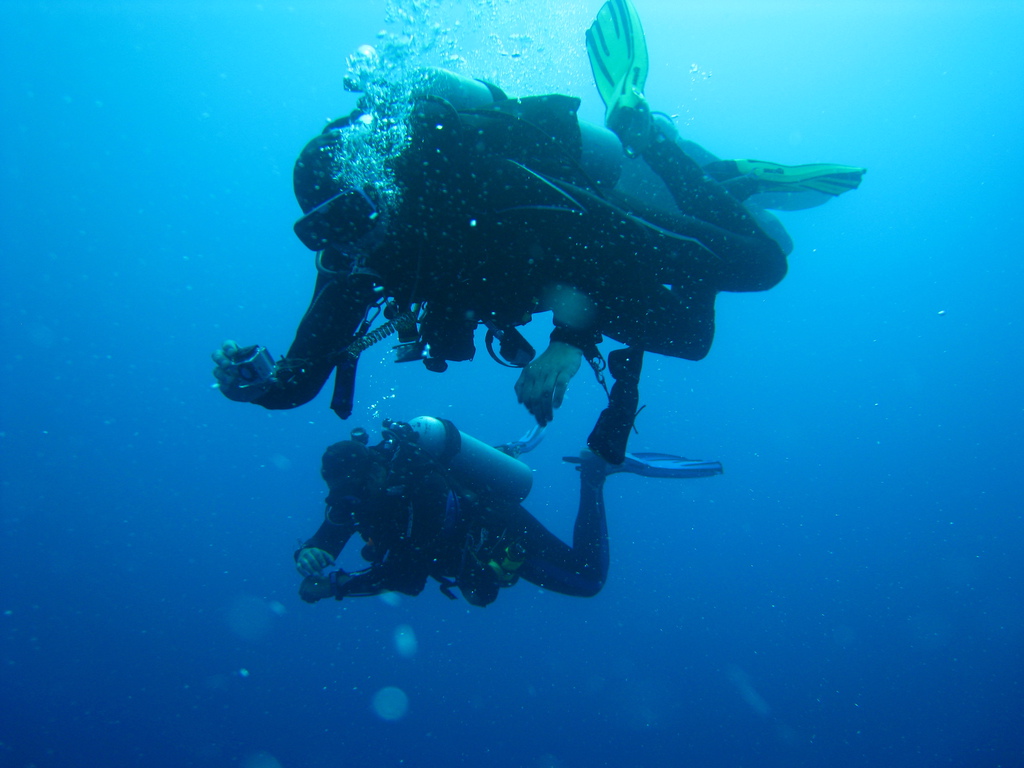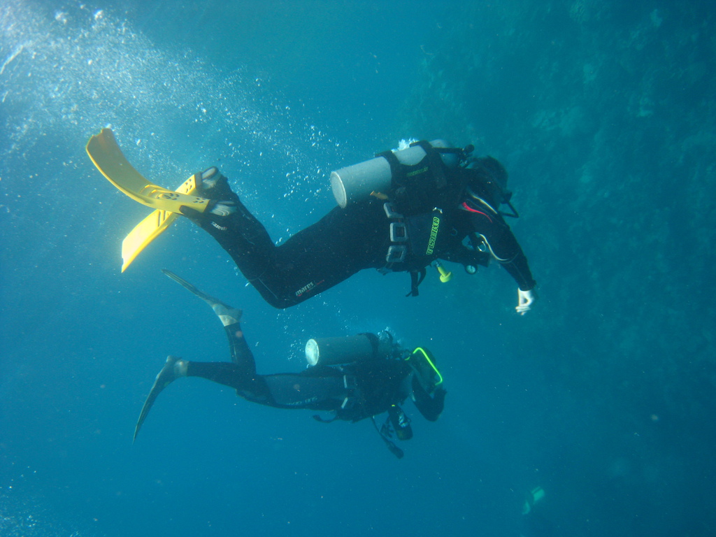 Nun aber zu dem Hauptgrund der Reise - TAUCHEN!!!! Direkt am Strand war die Tauchbasis: abschließbare Fächer für Zubehör, reichlich Flaschen, auch Nitrox, Frischwasserbassins und Trockenmöglichkeiten für Anzüge und Westen. Bevor jedoch das Nord- oder Südriff vom Strand oder per Schlauchboot erkundet werden konnte waren noch einige Formalitäten zu erledigen. Der Betreiber sichert sich mittels einer umfangreichen Checkliste gegen alle Eventualitäten ab. Sicherheit wird auch hier groß geschrieben, die Dekokammer ist in Sichtweite des Hotels, für den Fall der Fälle. Die ersten beiden Tauchgänge am Hausriff wurden von dem erfahrenen einheimischen Guide Maradona (sein Vater war oder ist wahrscheinlich fußballverrückt) souverän geführt. Alle Guides kennen sich nicht nur bestens an allen Tauchspots aus, weisen auf Highlights hin und unterstützen die - sagen wir mal nicht so erfahrenen Taucher. Die Vorbesprechung zeichnet durch klare Strukturierung und ausreichende Informationen zu Verlauf des TG aus.